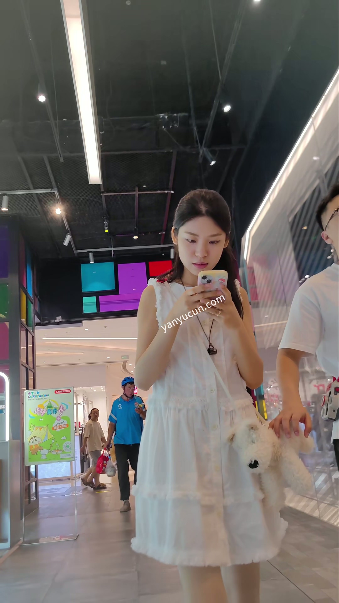 XM368白色了连衣裙小姐姐和男朋友逛街,粉色斑点内